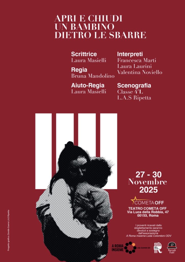 Dal 27 al 30 novembre al Teatro Cometa OFF andrà in scena uno spettacolo teatrale molto speciale: Apri e Chiudi, un bambino dietro le sbarre, la storia di un bambino cresciuto in carcere fino ai tre anni, raccontata con delicatezza dalla regista Bruna Mandolino che, colpita dalla sua vicenda, ha scelto di trasformarla in un copione intenso e profondamente umano, con il contributo della scrittrice Laura Masielli. Crescere in un ambiente detentivo significa fare i conti con insicurezza, stimoli limitati, poca socializzazione e una visione del mondo molto ristretta. Sono difficoltà psicologiche silenziose, che spesso restano invisibili, ma che segnano profondamente i primi anni di vita. Partecipare allo spettacolo significa sostenere il nostro lavoro accanto alle madri detenute e ai loro bambini. Il ricavato finanzierà i nostri progetti e ci permetterà di continuare ad essere presenti dove c’è più bisogno. Aiutateci a diffondere questa storia! Perché più persone la ascolteranno, più questi bambini esisteranno davvero agli occhi del mondo.